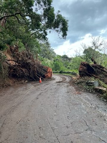 (6:10 a.m., March 15, 2026) Crater Road (Route 378) remains closed beginning at Mile 2.5 and Kula Highway (Route 37) remains closed from Mile 15 to 17. HDOT will be clearing the trees and mud from the areas this morning.
