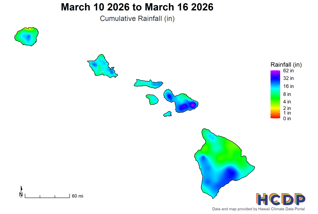 Maui was hit the hardest, with peak rainfall totals reaching 62 inches in localized regions. Hawaiʻi Island also saw heavy precipitation, with areas recording 16–32 inches, and isolated spots also nearing 62 inches. Both Kauaʻi and Oʻahu recorded maximum totals ranging 16–32 inches. Molokaʻi and Lānaʻi experienced peak amounts 4–16 inches.