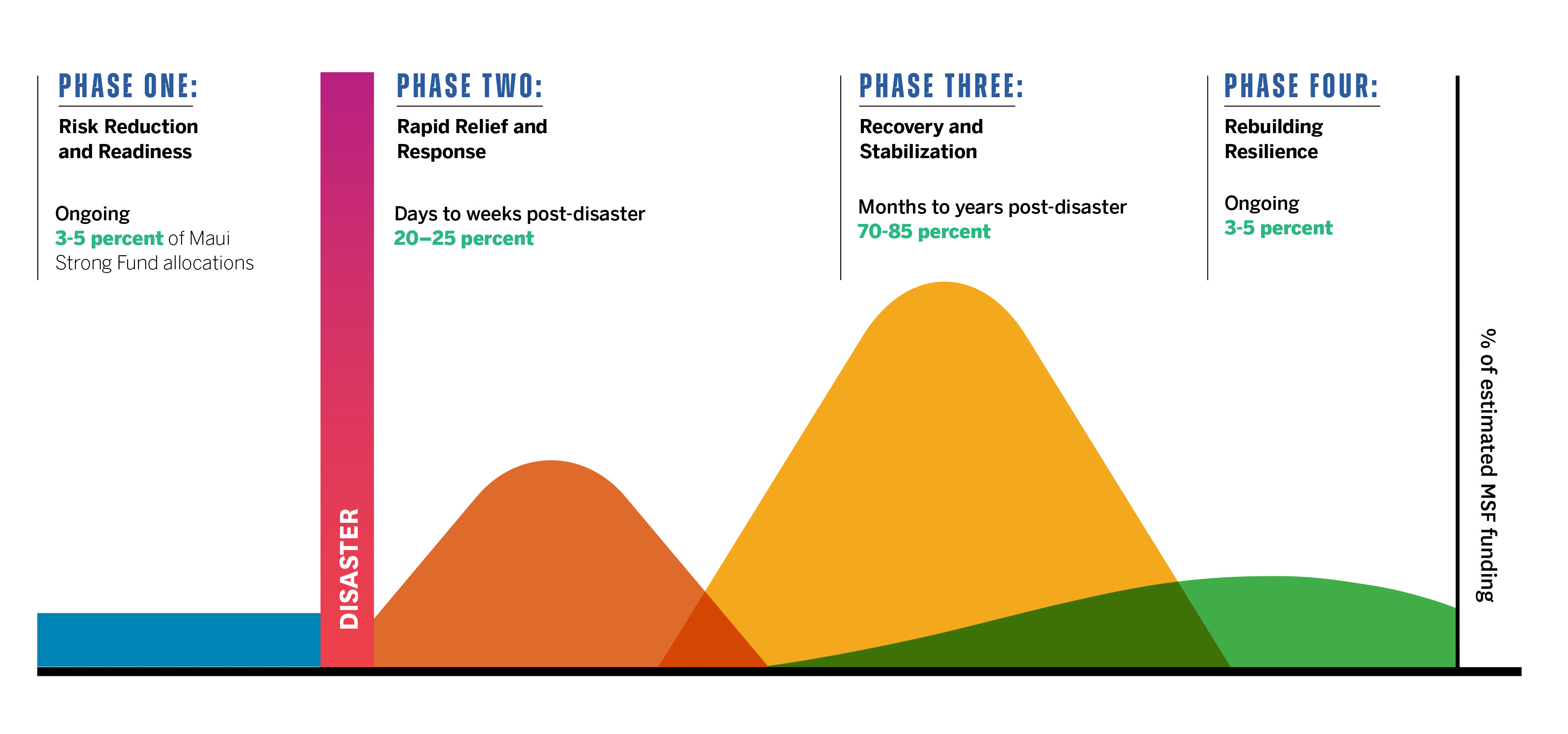 The Stronger Hawai‘i Fund supports communities before, during, and after disaster through four phases of response: Risk Reduction and Disaster Readiness, Rapid Relief and Response, Recovery and Stabilization, and Rebuilding Resilience. HCF’s approach ensures that philanthropic investments go further by coordinating with trusted community partners who understand the on-the-ground needs of the people they serve.