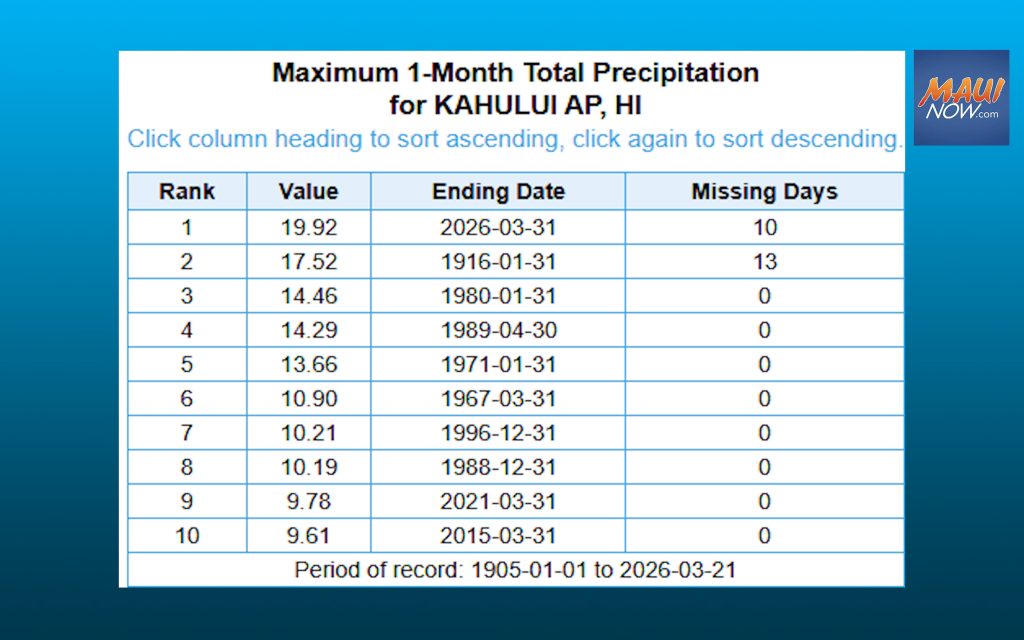 With 10 days left to go, Kahului is already experiencing its wettest month ever, according to the National Weather Service. The NWS Honolulu office released a chart showing the top 10 wettest months all time. So far this month, through March 21, Kahului has already seen 19.92 inches of rain.