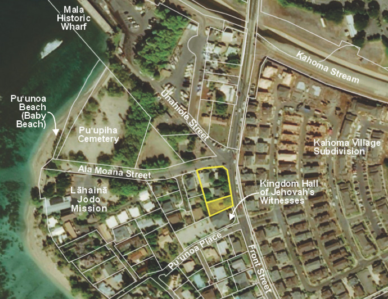 The property sits adjacent to the Lahaina Kingdom Hall of Jehovah’s Witnesses. It currently holds an urban designation and residential zoning.