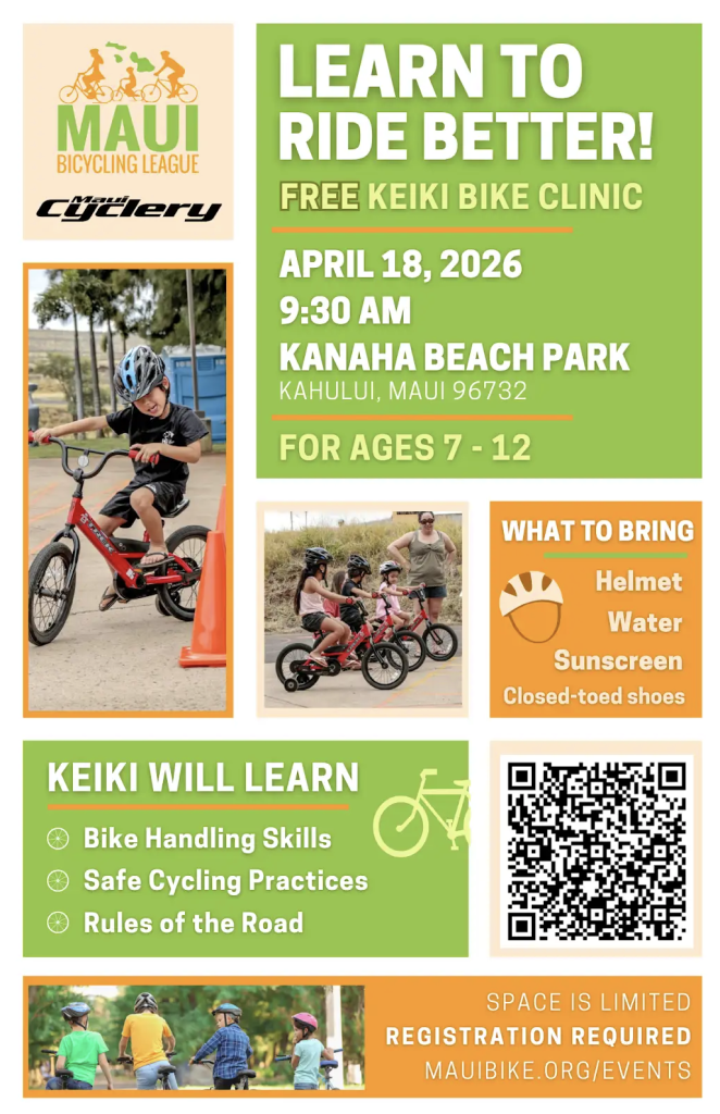 The Maui Bicycling League is expanding its Keiki Bike Education Program with the launch of the “Learn to Ride Better Keiki Clinic” at Kanahā Beach Park, offering keiki ages 7–12 the opportunity to build confidence, improve bike handling skills, and learn how to ride safely and responsibly.