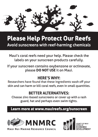 The nonprofit Maui Nui Marine Resource Council (MNMRC), with support from the County of Maui Mayor’s Office of Economic Development, is offering free materials to educate visitors and residents about this transition and encourage them to curtail use of sunscreens they already own that containing oxybenzone and octinoxate.