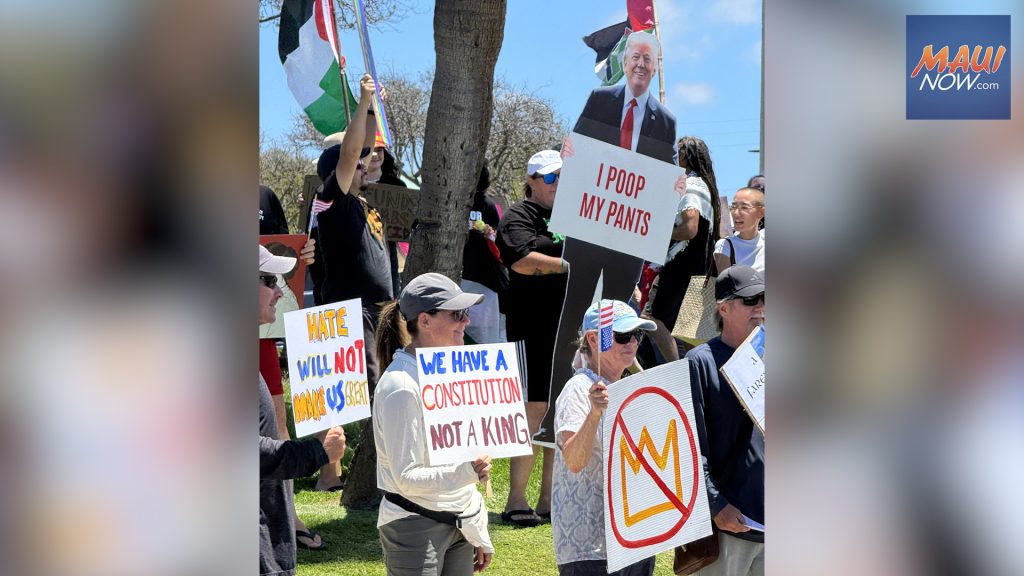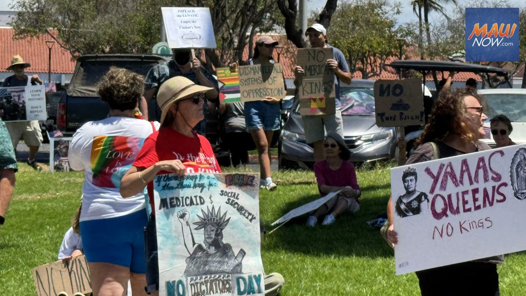 A “No Kings” event on Maui drew a crowd of demonstrators along Kaʻahumanu Avenue in Kahului, stretching from the Wākea Avenue intersection, past South Kāne Street on Saturday afternoon.