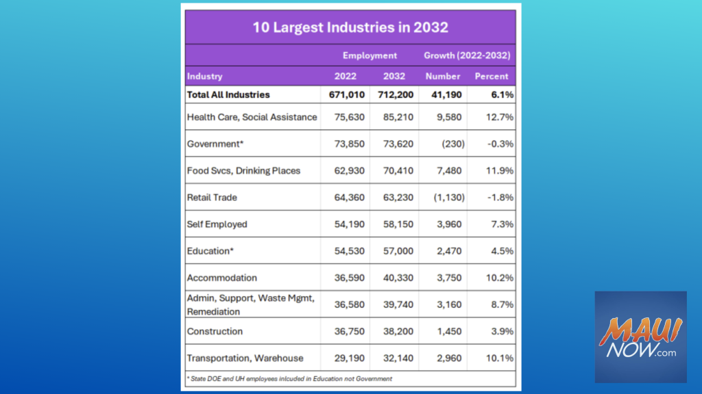 The state’s total employment is projected to grow by 6.1% over the next decade, adding 41,190 jobs between 2022 and 2032, according to new labor market projections from the Hawai‘i State Department of Labor and Industrial Relations’ Research and Statistics Office.