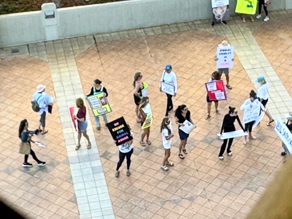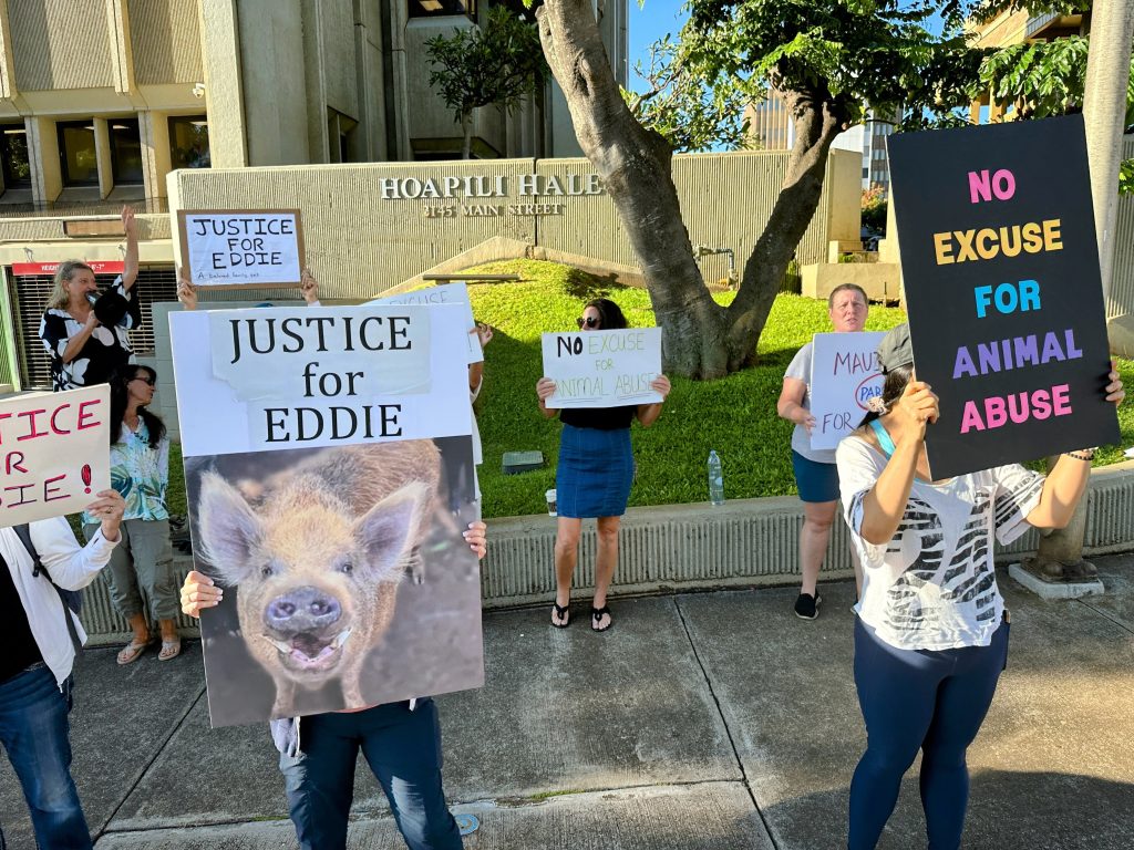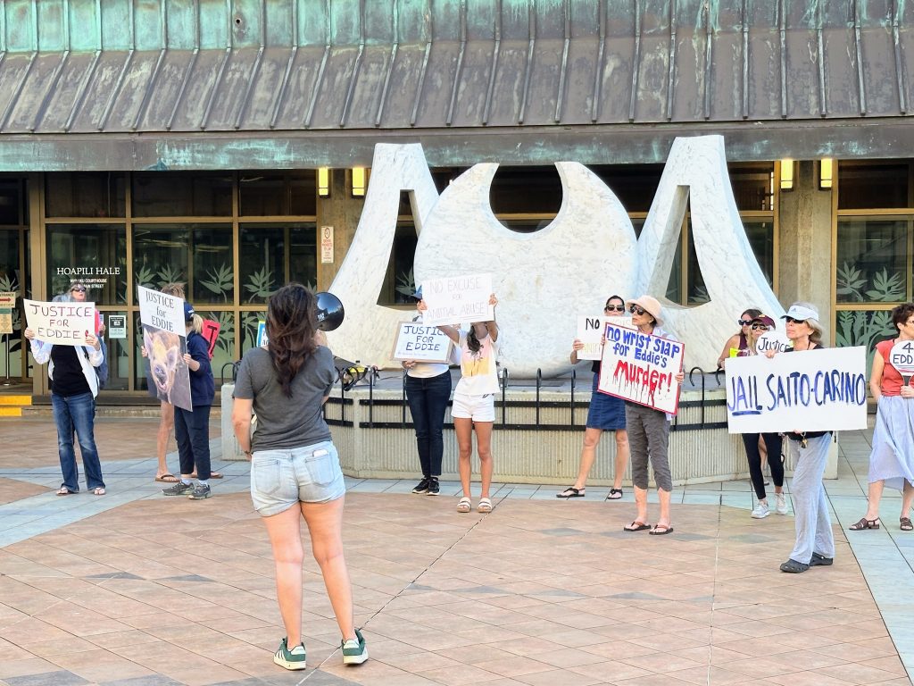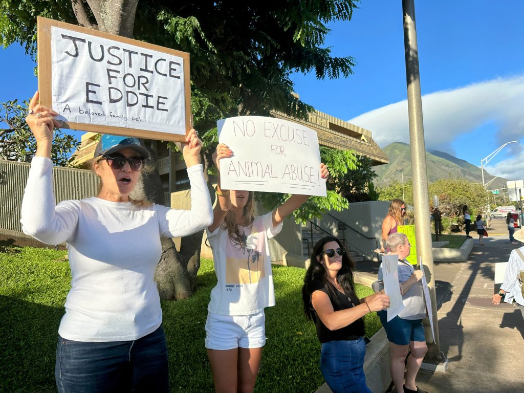 The sentencing followed an hourlong demonstration outside Hoapili Hale, the second-circuit courthouse in Wailuku. More than two dozen protesters waved hand-painted signs and chanted: “No excuse for animal abuse,” “Jail Krys Carino” and “Eddie! Eddie! Eddie!”