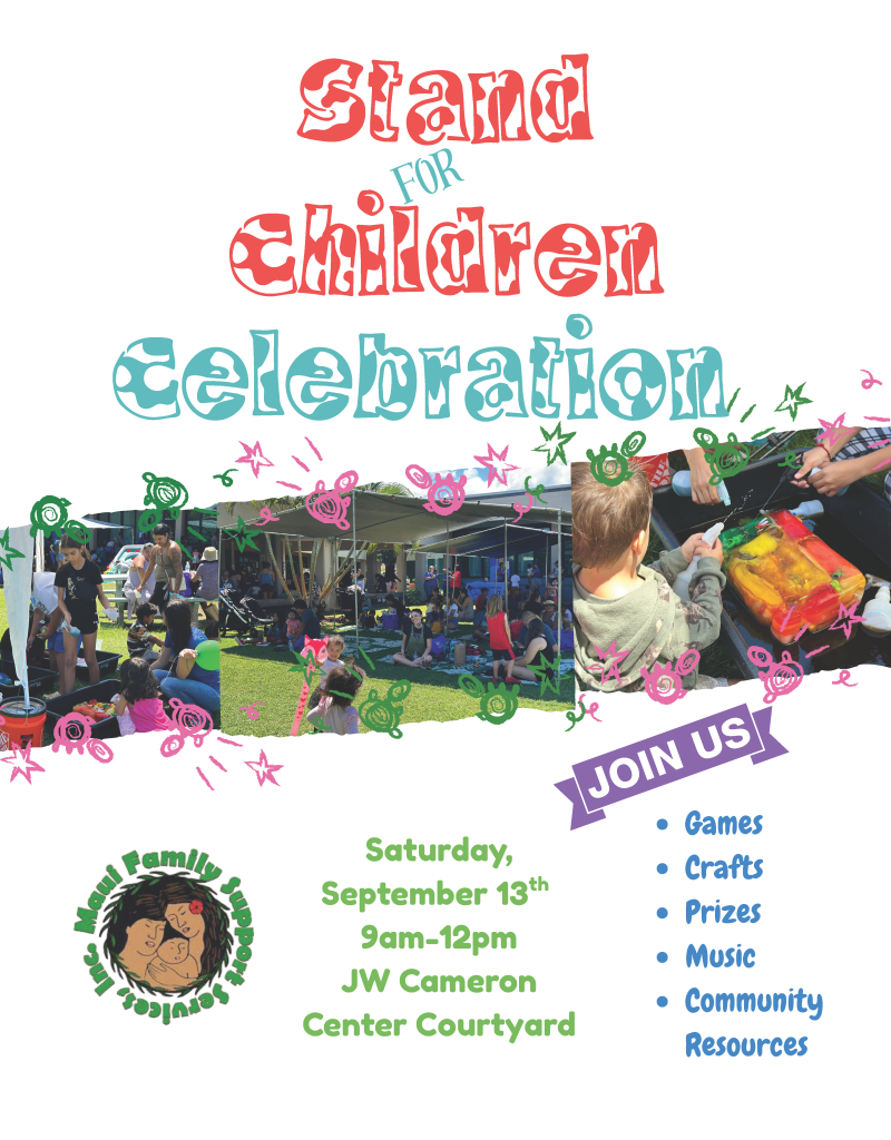 Maui Family Support Services, Inc. invites families across Maui County to join the annual Stand for Children Celebration on Saturday, Sept. 13, from 9 a.m. to 12 p.m. at the JW Cameron Center Courtyard in Wailuku.