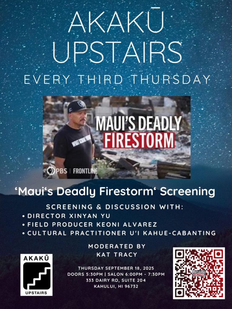 Akakū Upstairs hosts a screening of PBS Frontline’s “Maui’s Deadly Firestorm,” on Thursday, Sept. 18, 2025 from 6 to 7:30 p.m. in Suite 204.