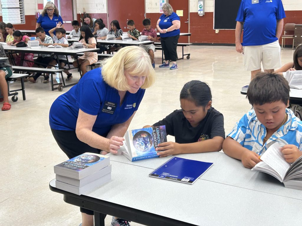 A “Dictionary Treasure Hunt” activity was held for all the students to help them learn how to use their new reference book. They learned how to look up word definitions, find the times tables, and even identify the state tree of Hawaiʻi in this fun activity facilitated by Rotary Maui Island Resource Chair Joanne Laird.